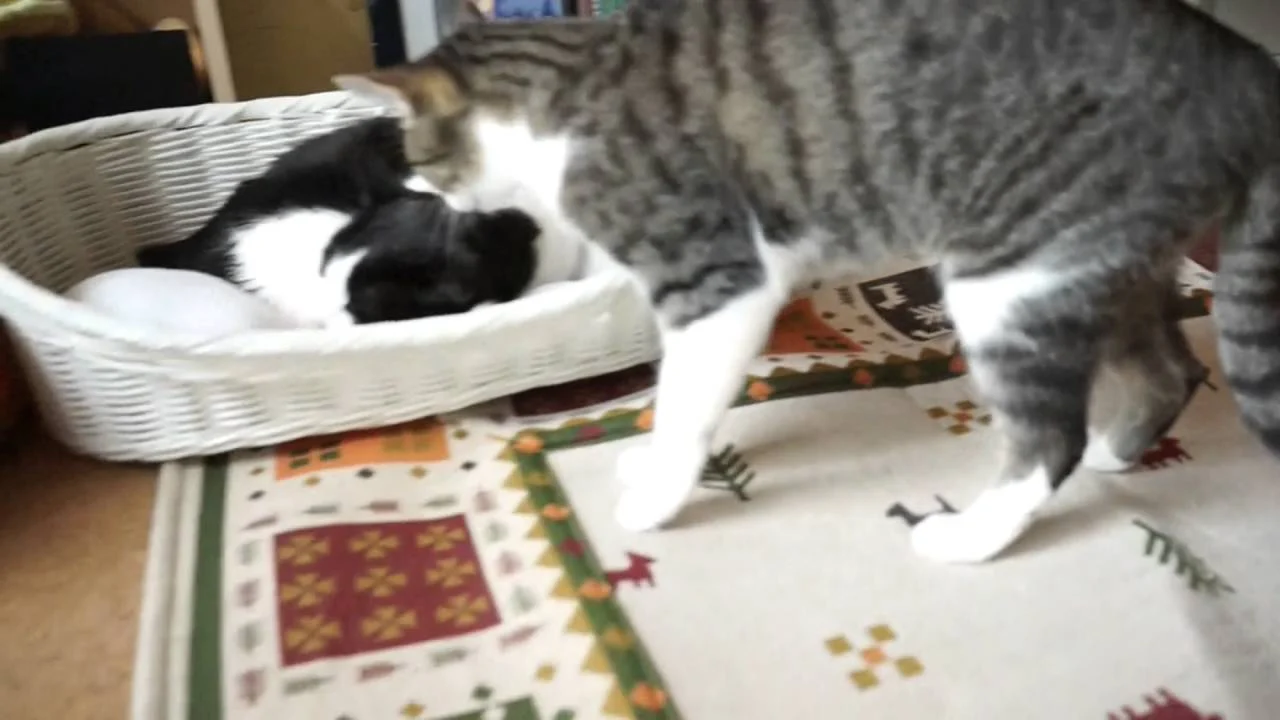 Un gatto cerca di prendere un giochino che è sul tappeto. Peccato sia andato troppo lungo nel salto rischiando di finire addosso al suo amico.