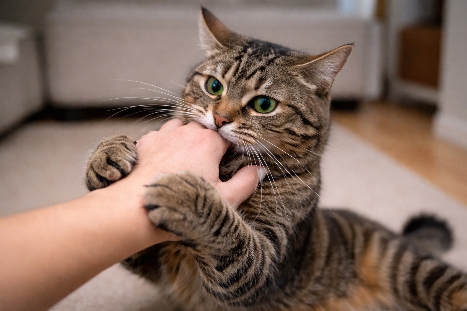 In questi casi il gatto accumula energia predatoria che non riesce a scaricare in modo adeguato. L’attacco non è rabbia, non è vendetta, non è “cattiveria”: è una risposta istintiva fuori contesto.