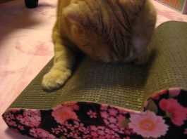 Una cuccia a forma di hamburger. Che bella che è! E il gatto si trova proprio a suo agio lì dentro.