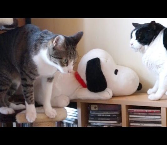 Questo gatto ruba il pollo al suo amico piccino che si trova sul seggiolone.