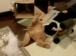 Questo piccolino è proprio impertinente! Si diverte a infastidire mamma gatta che cerca di riposare tranquillamente. Qui ci vuole un po' di disciplina!