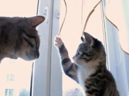Questo gattino ama andare sullo scivolo. Ma per fortuna arriva mamma gatta a controllare che il piccolo non si faccia male.