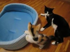 Questi gattini si divertono a tempo di musica. Ma dopo un po' uno si stufa e se ne va.