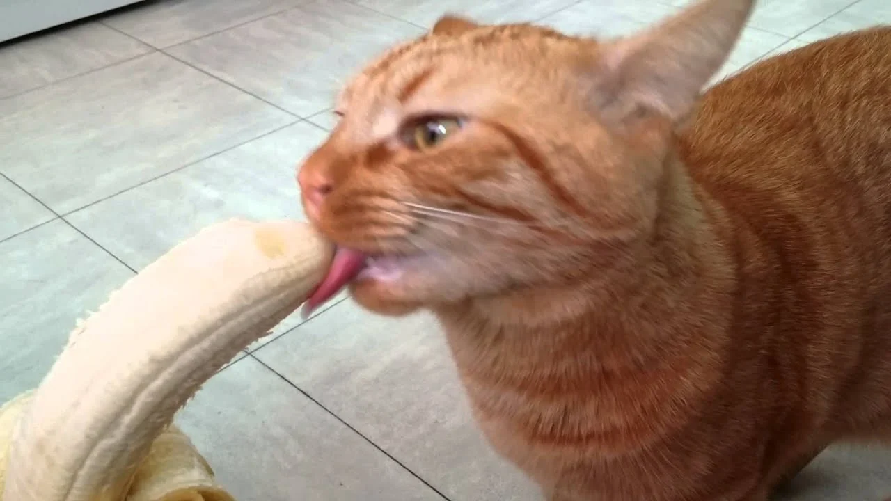 Questo gatto ama proprio mangiare la banana. Certo, è dolce, come non piacere?