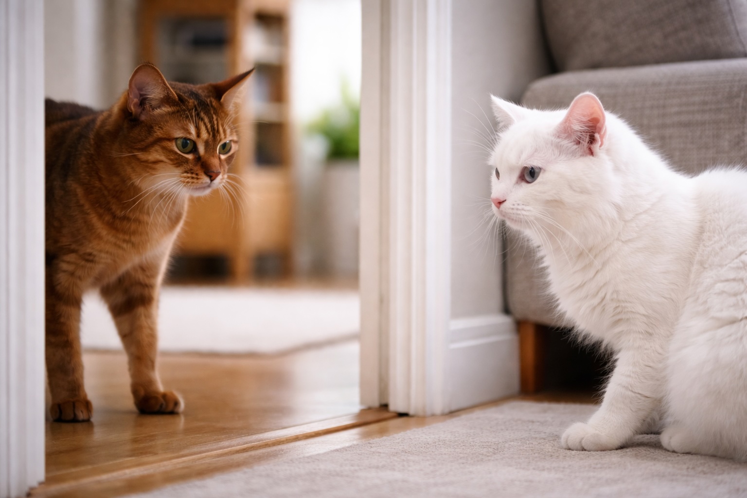 Molti conflitti territoriali tra gatti non iniziano con un attacco. Spesso si sviluppano in modo più sottile, attraverso tensioni quotidiane, blocchi di passaggio o inseguimenti improvvisi.