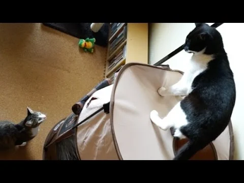 E’ bello guardare il mondo dall’alto, è questo micio ne è consapevole: non vuole proprio scendere dalla sua postazione, anche se incitato dal suo amico felino, che a un certo punto trova il sistema per “convincerlo”