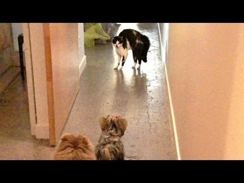 In casa arrivano dei cagnoilni che sono ben disposti a fare conoscenza con i gatti, ma questi ultimi non sembrano molto favorevoli…