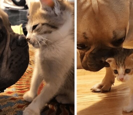 Un cane cerca di rianimare un gatto che è appena stato investito da un’auto