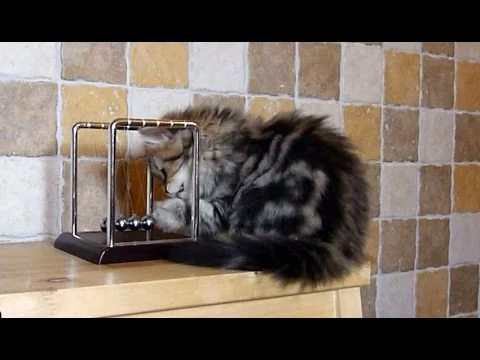 Questi gattini si divertono a giocare con il pendolo di Newton. Quante belle palline!