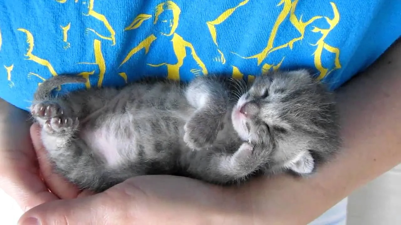 Comodamente adagiato tra le mani dei suoi umani, questo gattino di tre settimane dorme, fa le fusa e sogna allo stesso tempo. Non è un amore?