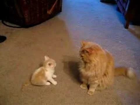 Temerario questo gattino, o semplicemente ha una gran voglia di giocare, non solo con i suoi fratellini, ma anche con i gatti più grandi. Guardate quant’è buffo