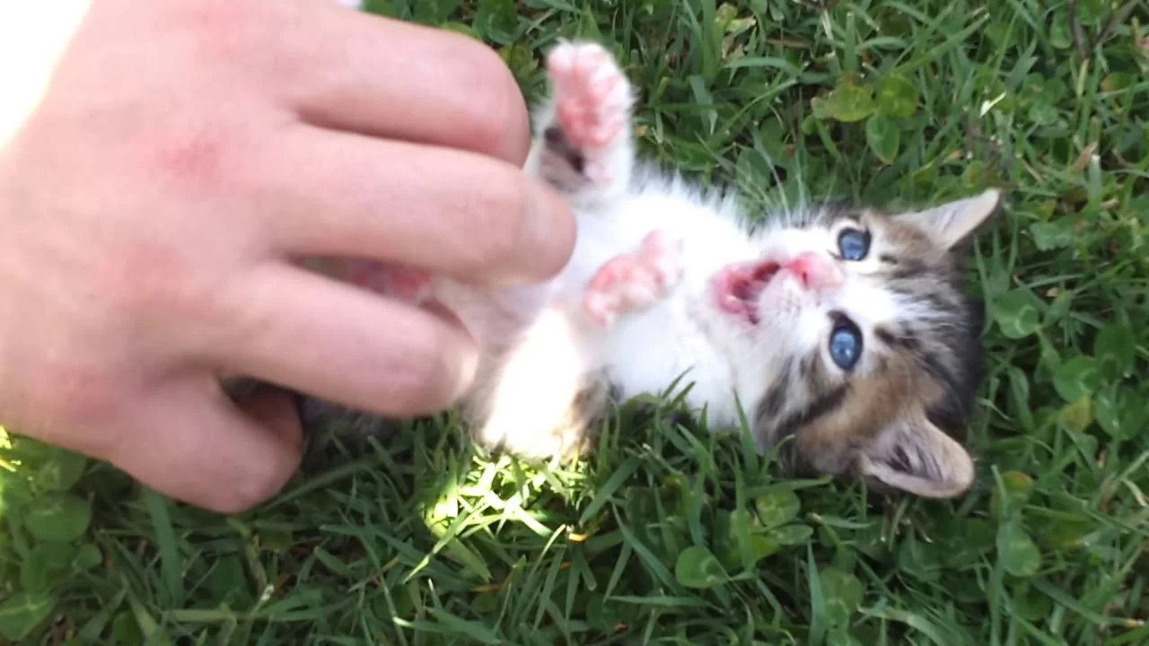 L’amico umano lo coccola e gioca con il piccolo gattino che sembra molto apprezzare. La sua risata assomiglia a quella di un bimbo piccolo.