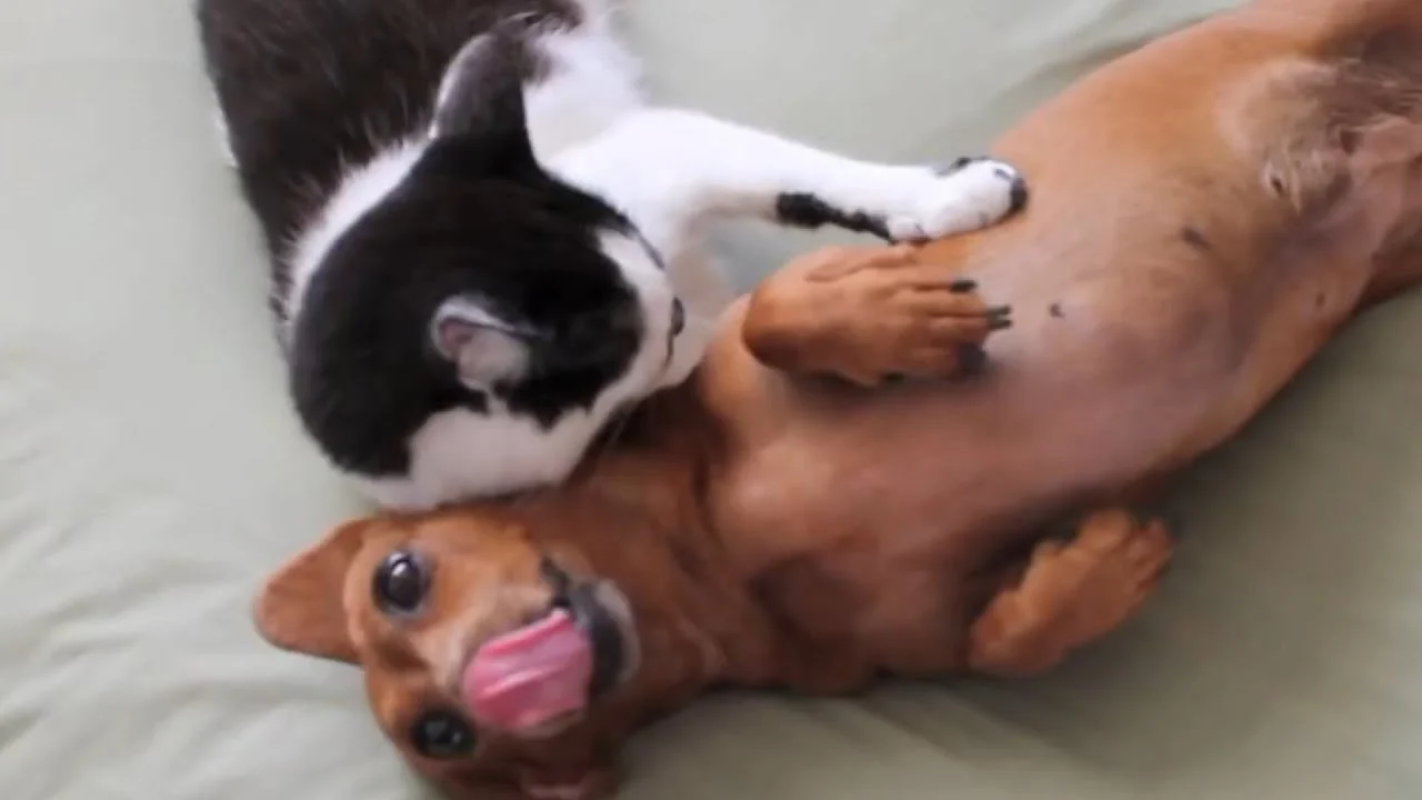 Questo bassotto è davvero molto agitato, ma per fortuna c’è il suo amico felino a tranquillizzarlo e a coccolarlo. Rigorosamente sul lettone…