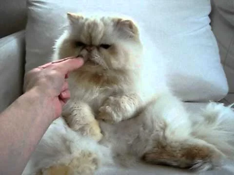 Questo gatto è un po’ viziatello. Guardate in che modo ama mangiare. Seduto sul divano si fa imboccare.