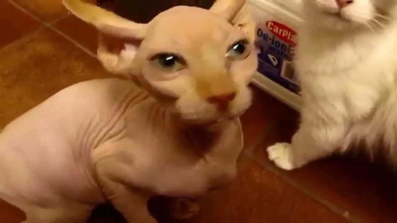 Gru è un gatto Sphynx e vive con Blu, esemplare di Ragdoll. In questo video Gru chiede insistentemente la pappa alla sua mamma umana, con miagolii al limite della disperazione. Tranquillo, Gru, le pappe stanno arrivando