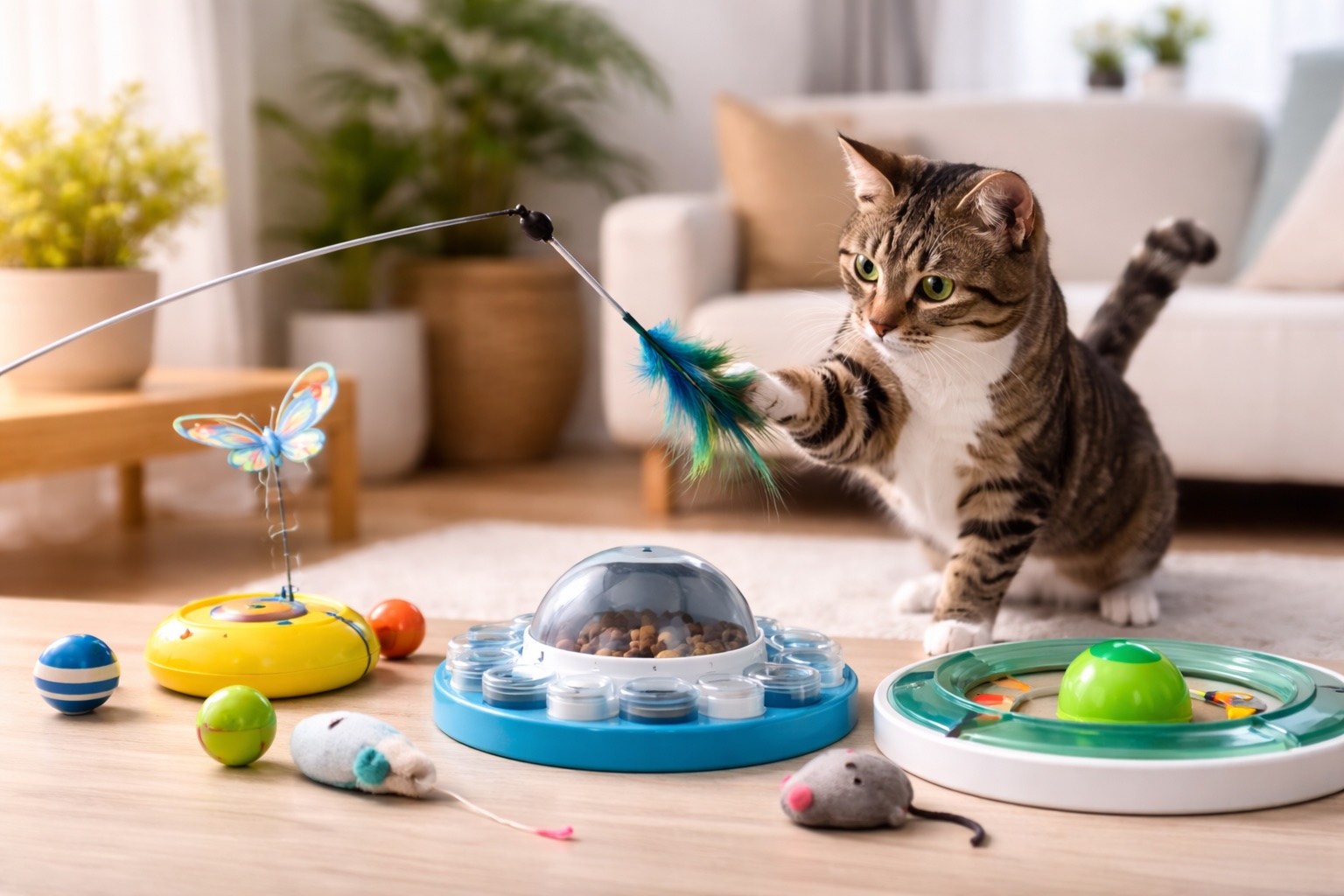 Il movimento imprevedibile è ciò che accende l’attenzione. Le bacchette con piume o cordini funzionano perché imitano una preda in fuga. Le palline leggere stimolano l’inseguimento se rimbalzano in modo irregolare.