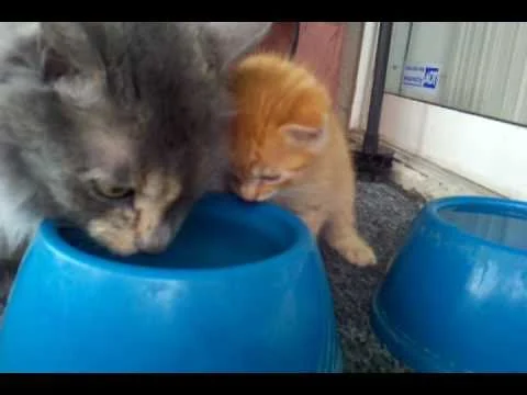 Le mamme gatto sono ottime insegnanti. Guardate come questo adorabile micino, con gli occhi più azzurri, impara a bere l’acqua dalla ciotola. Tutto questo è semplicemente troppo carino.
