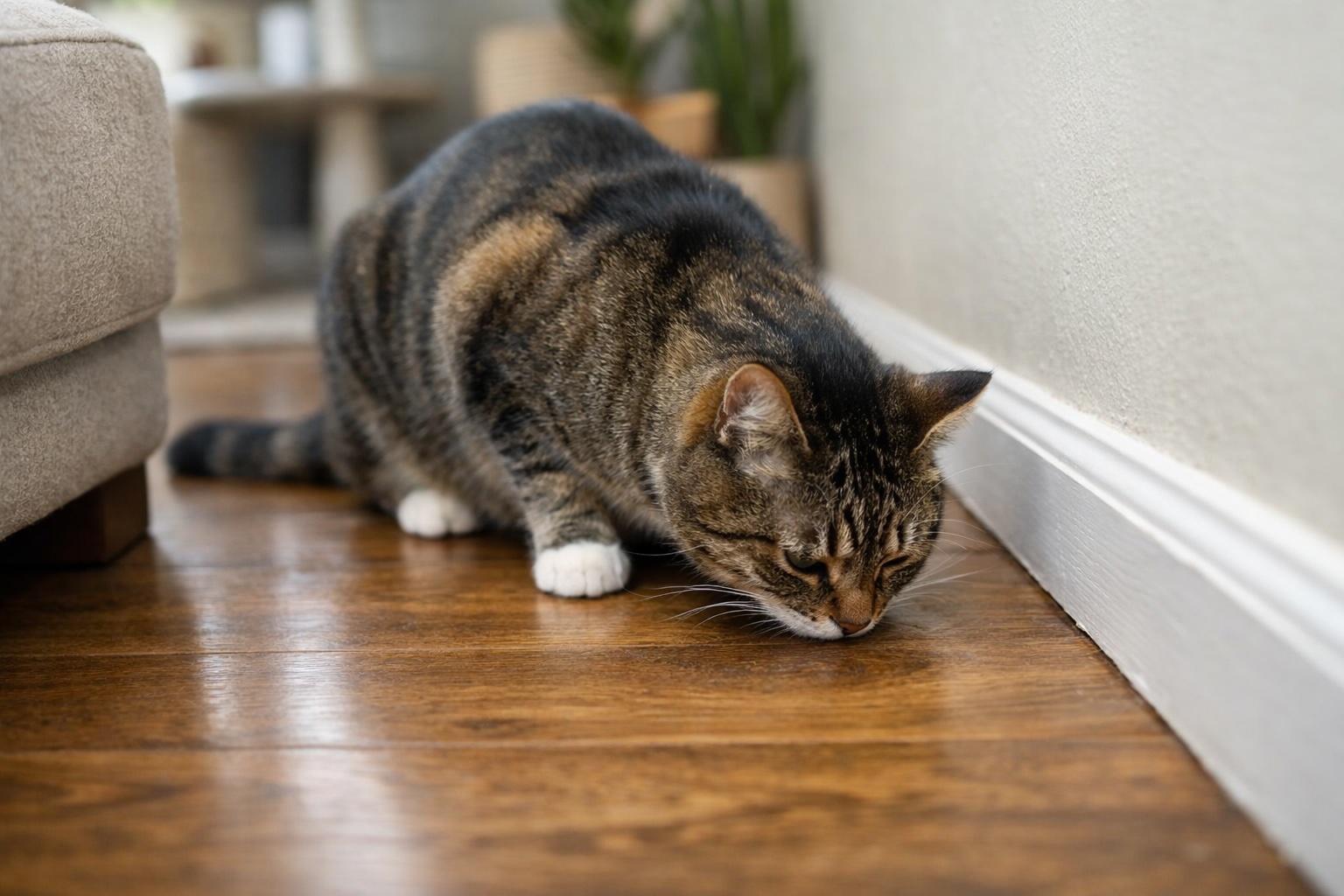 Il gatto lo percepisce e interpreta quella zona come un posto già marcato. Non lo fa per provocazione: semplicemente sta seguendo un segnale olfattivo che per lui è ancora chiarissimo.