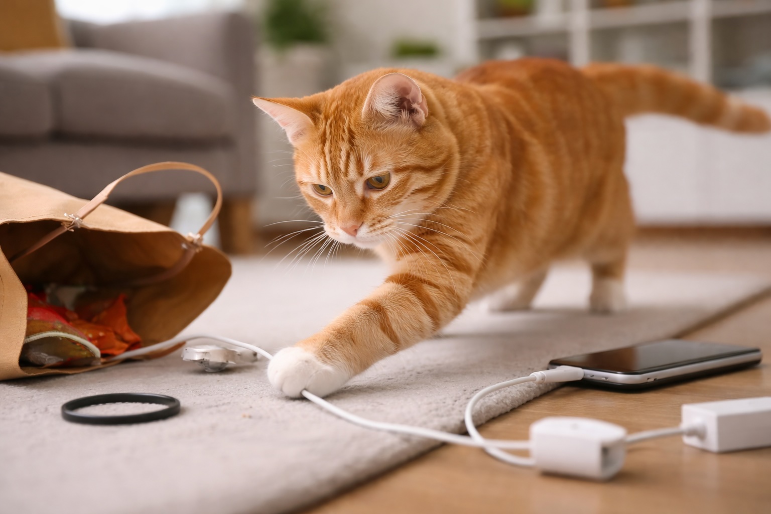 I cavi sottili che pendono o restano a terra sembrano fatti apposta per essere afferrati. Alcuni gatti li interpretano come prede mobili e iniziano a morderli o giocarci, soprattutto se sono giovani o molto attivi.
