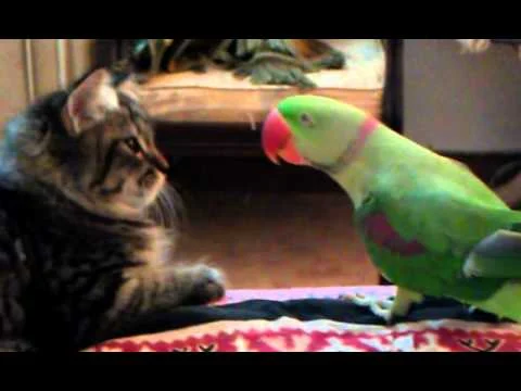 Questo pappagallo imita il verso del gatto in modo incredibilmente realistico. Il povero micio è un po’ spiazzato dalle “parole” del pennuto che, pur parlando in gattese, non è un gatto!