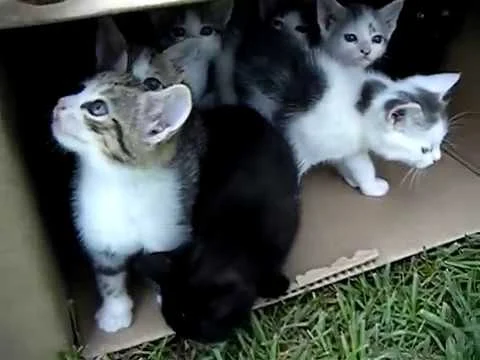 Sono nati in casa e non sono mai usciti all’aperto questi dieci gattini che per la prima volta, assistiti da mamma gatta, cominciano le esplorazioni in giardino.