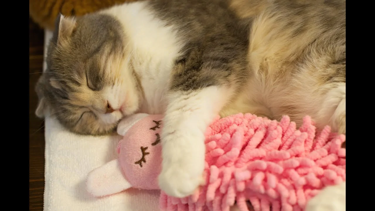 Ogni bambino ha un piccolo peluche, una “coperta di Linus” che accompagna i suoi sogni. Beh anche per questo gatto è la stessa cosa con la sua piccola bambolina rosa.