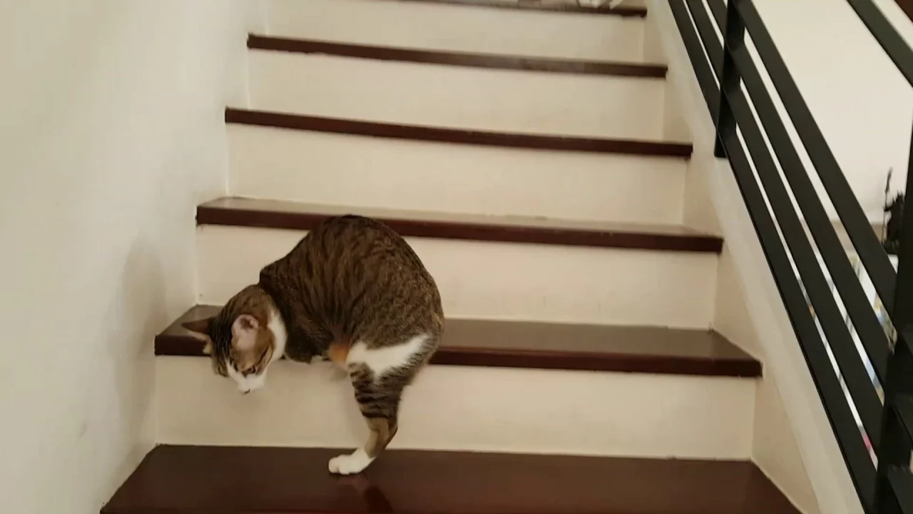 Questo sfortunato micio, nato senza le zampe anteriori, non solo ha imparato a camminare perfettamente su due zampe, ma anche a scendere e salire le scale. Nonostante la sua grave menomazione riesce a condurre una vita normale. Bravo micio!