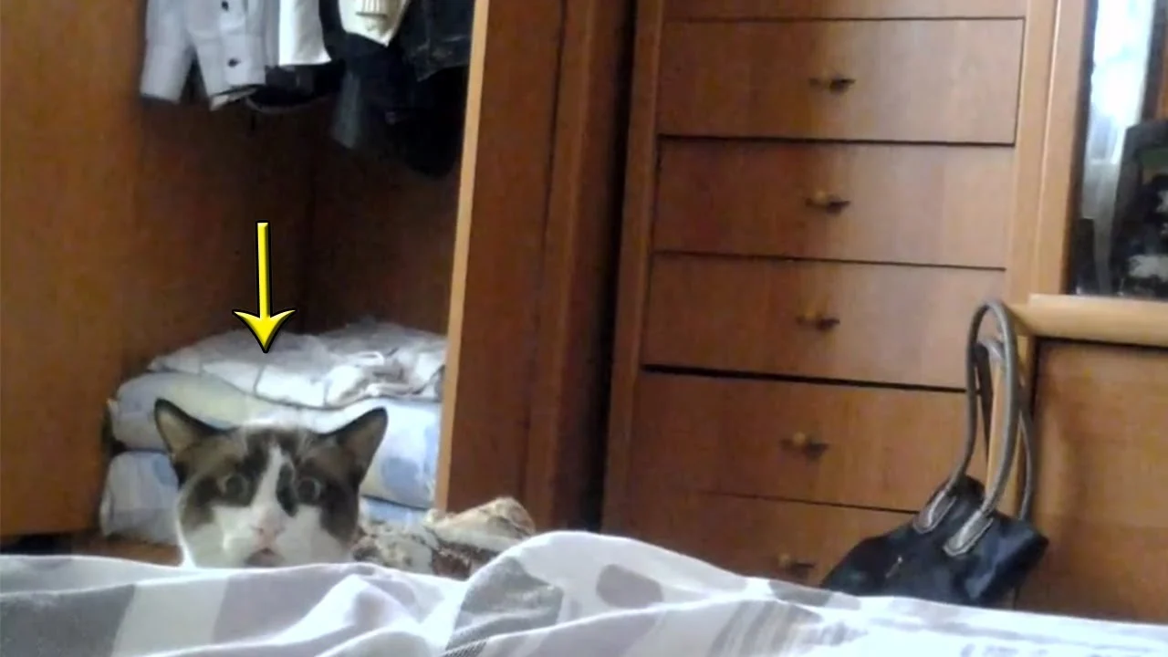Un gatto stalker si nasconde dietro al letto