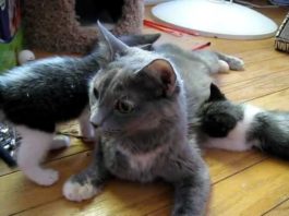 Questo piccolino è proprio impertinente! Si diverte a infastidire mamma gatta che cerca di riposare tranquillamente. Qui ci vuole un po' di disciplina!