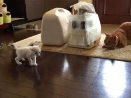 Adorabile guardare come questa gattina fissa e miagola verso il suo nuovo soffice amico. Lei è così felice di avere un nuovo coinquilino. Sono...