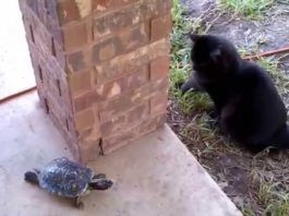 Gatto temerario affronta cinque grossi cani