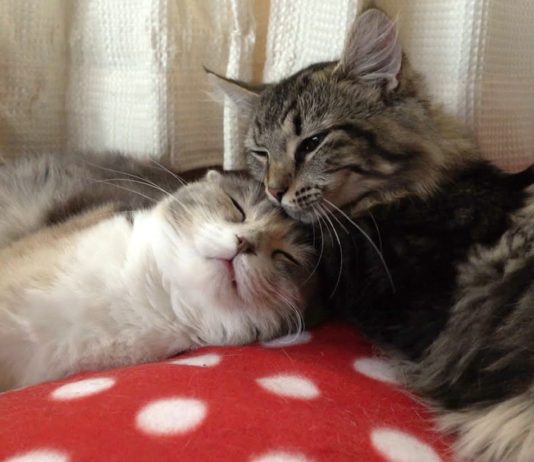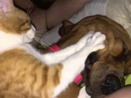 Questo cagnolino è proprio tanto affettuoso nei confronti del suo amico gatto, che se ne sta buono buono a ricevere le coccole.