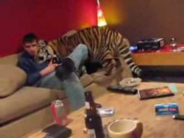 Questo adorabile cucciolo di tigre viene adottato da un Labrador
